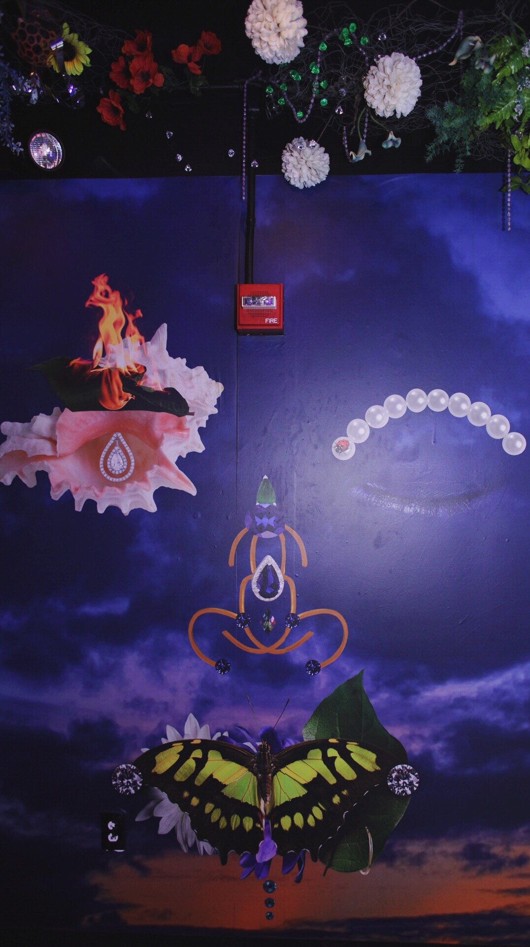 A surrealist photographic collage shot and then composited digitally. Elements of the face appear, layered underneath adornments of nature and jewelry. Painted by a thousand colors that includes a gradient of clouds to represent a sunrise and sunset.